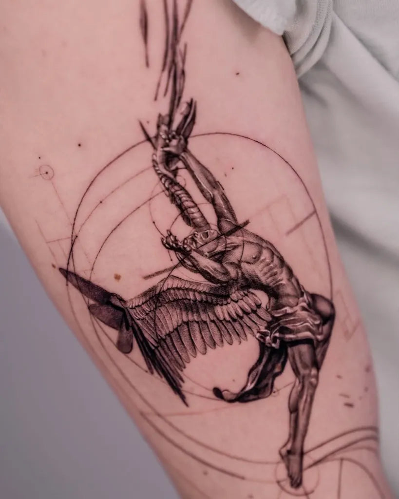 Big Blackwork Icarus with Geometric Sun and Winged Figures on Men Arm Tattoo by @clemente.tats