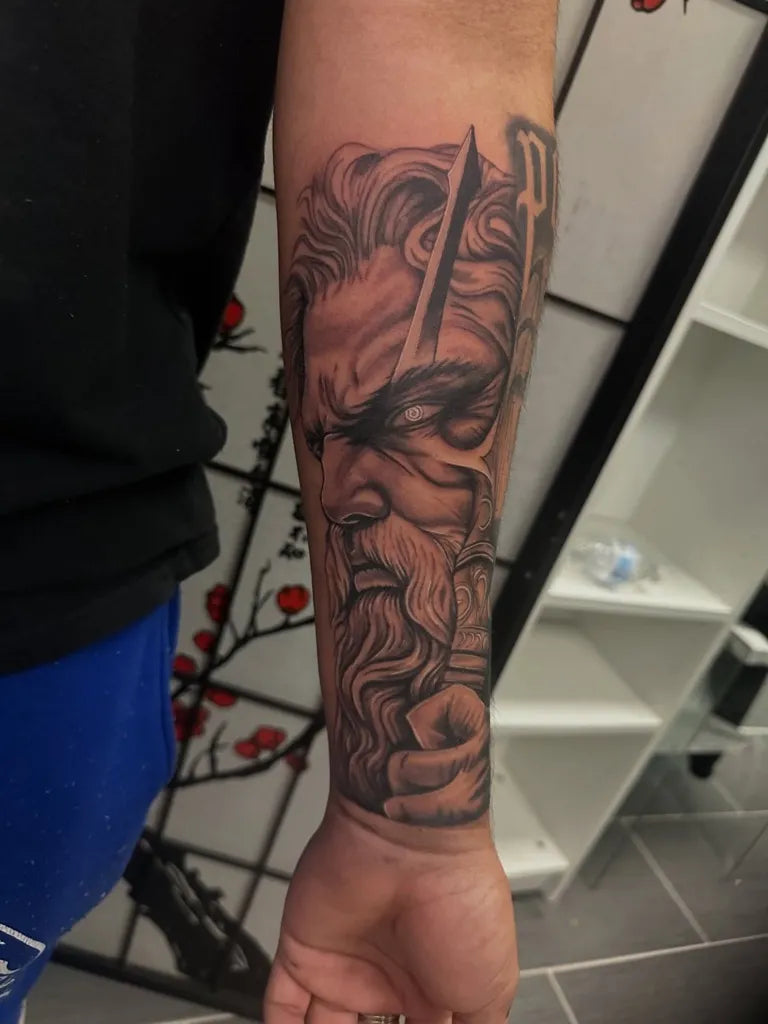Big Black and Grey Poseidon with Trident Tattoo on Men Inner Arm by @oh_its_tattoos