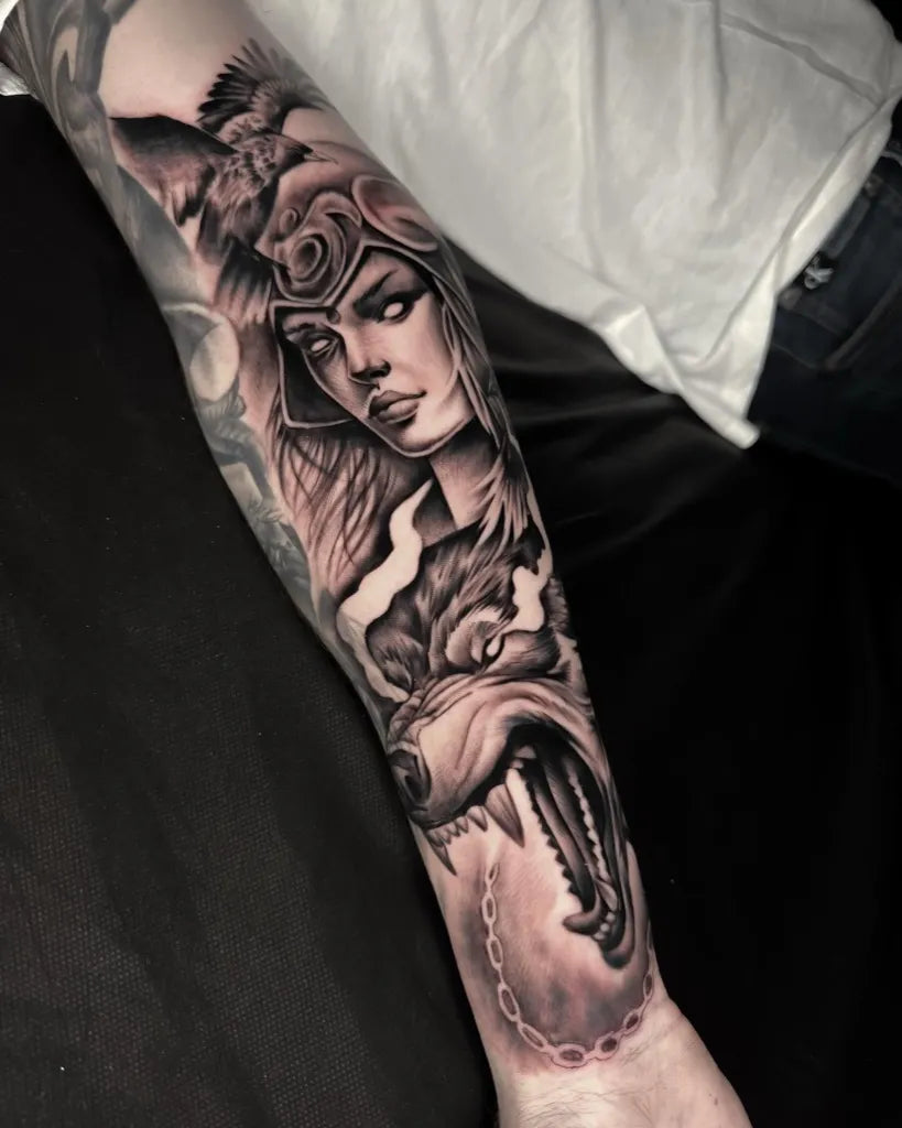 Big Black and Grey Valkyrie Wolf Tattoo on Men Inner Arm by @brycegarnhamtattoos