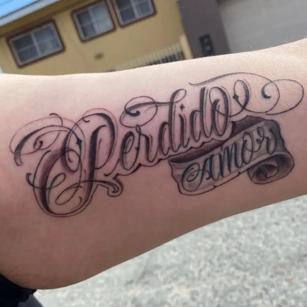 Medium Blackwork Text Tattoo on Men Inner Arm by @__amanda__please__