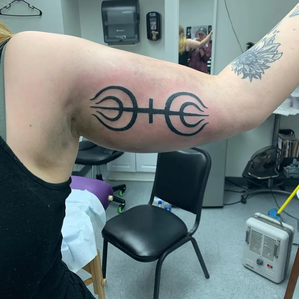 Medium Blackwork Symbol Tattoo on Women Inner Arm by @moonbay88