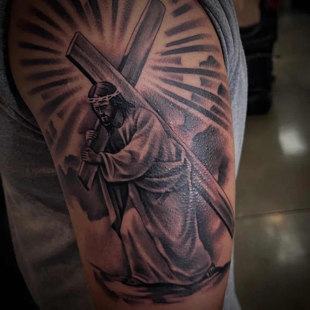 Big Black and Grey Jesus Carrying Cross Tattoo on Men Arm by @pry1tattoos