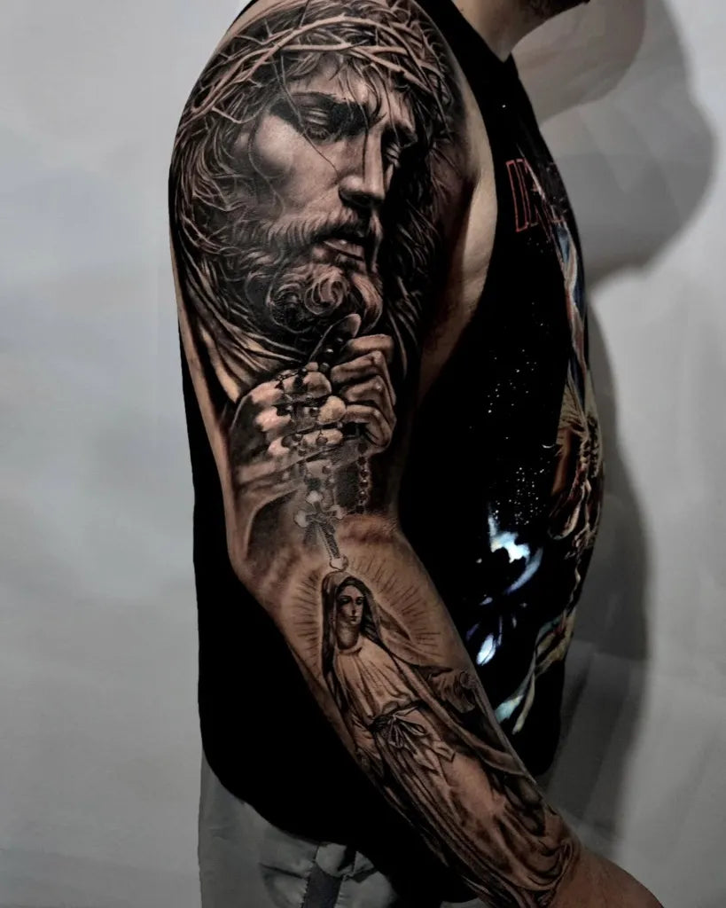 Big Black and Grey Jesus Mary and Rosary Tattoo on Men Arm by @murim.tattoo