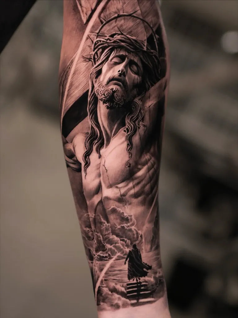Medium Black and Grey Jesus on Cross Tattoo on Men Arm by @addic.tedtoink