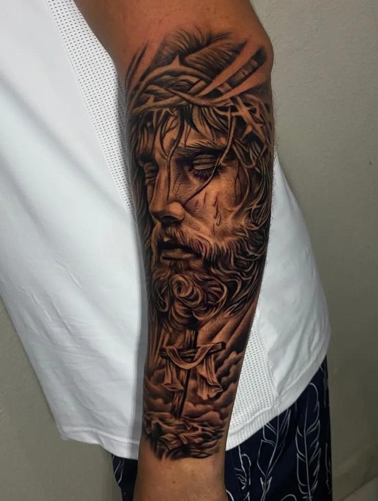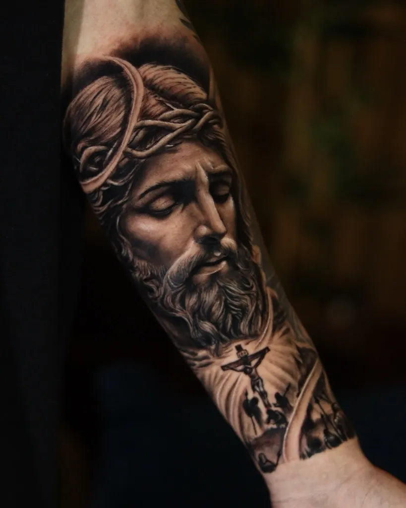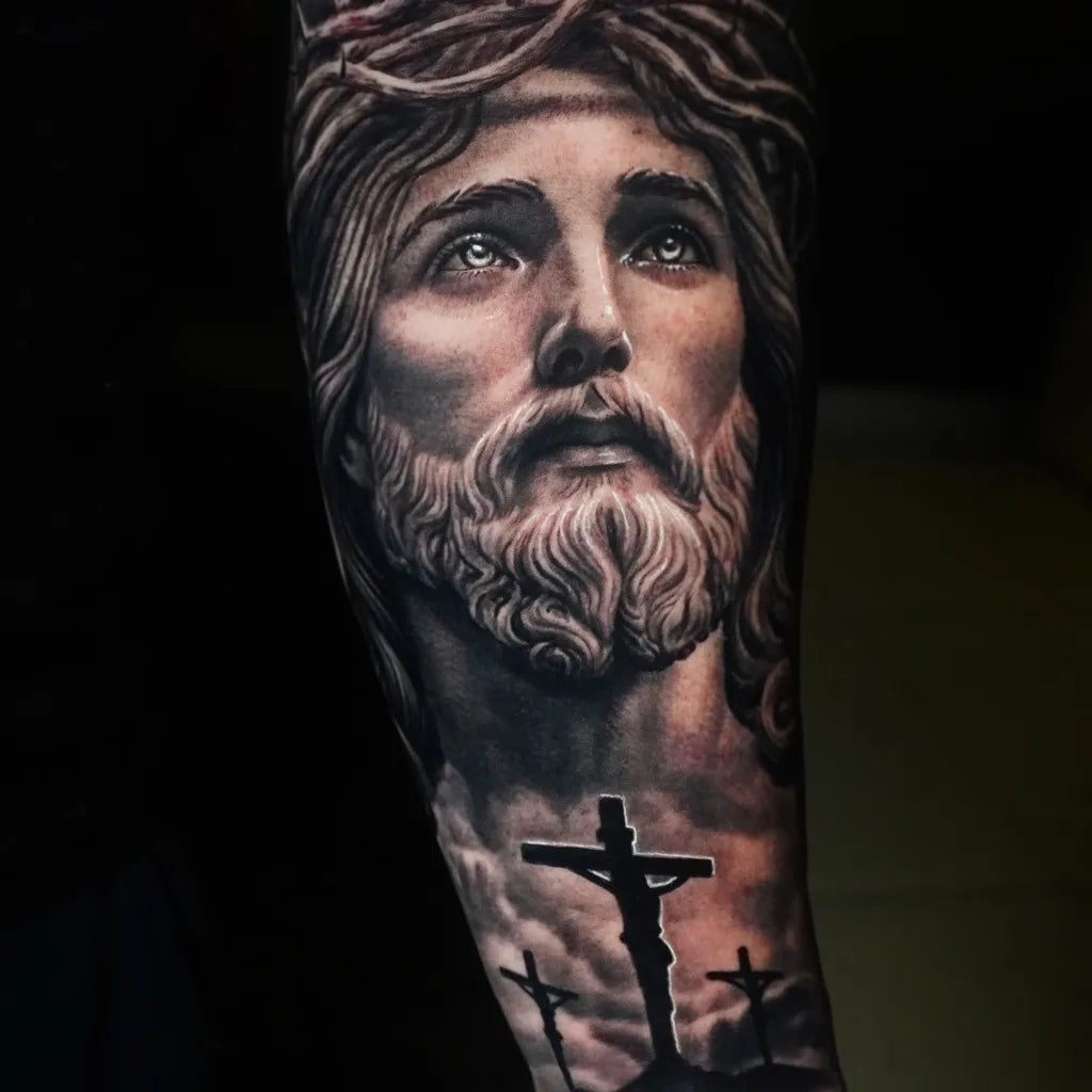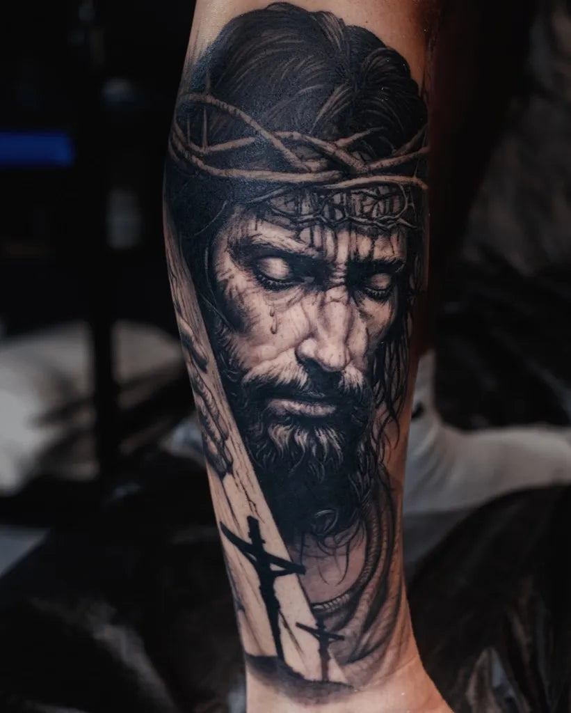 Big Black and Grey Jesus with Crown of Thorns and Crosses Tattoo on Men Arm by @outsyyde.tattoo