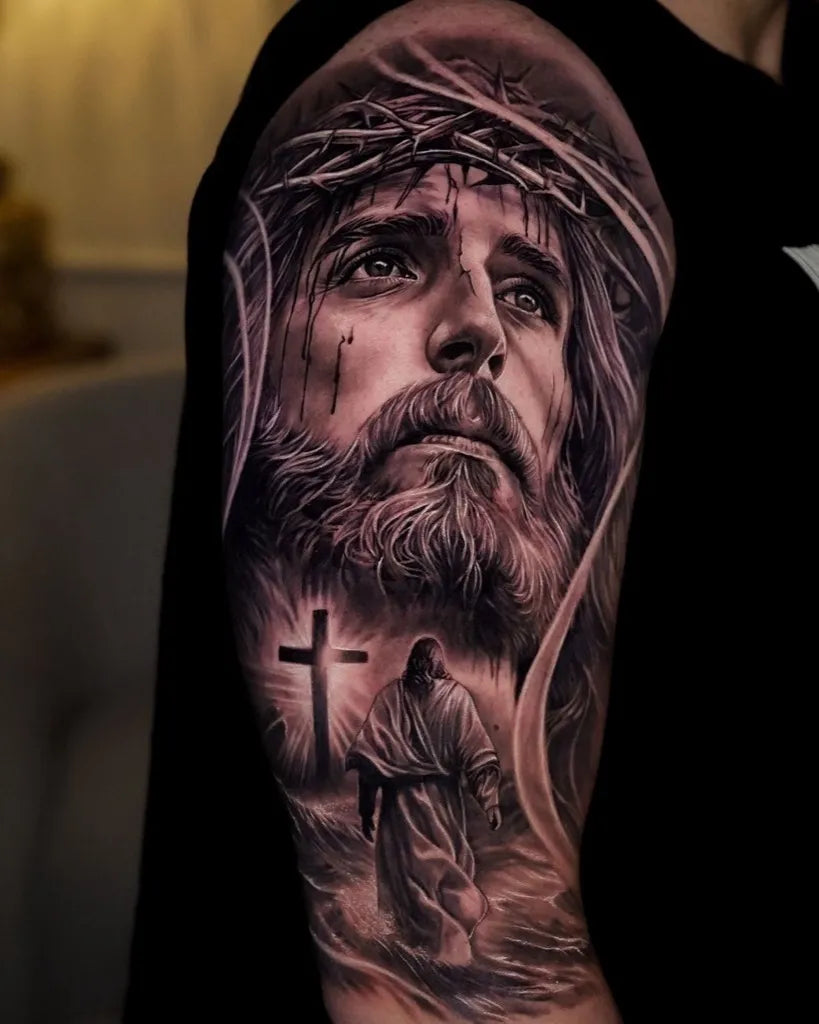 Big Black and Grey Jesus with Crown of Thorns and Cross Tattoo on Men Arm by @kaleo_tattoos