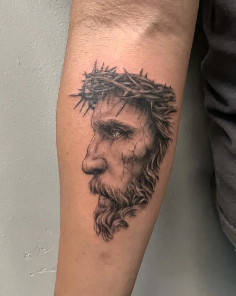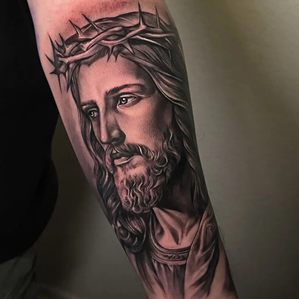 Medium Black and Grey Jesus with Crown of Thorns Tattoo on Men Arm by @devonfrancistattoos