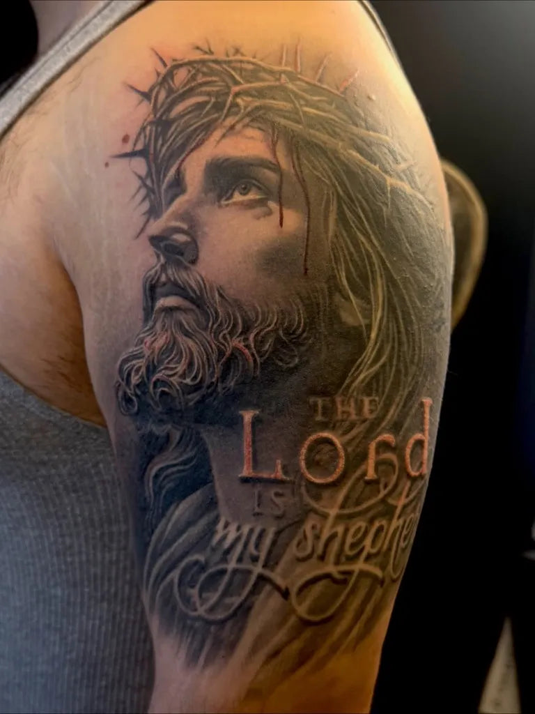 Medium Black and Grey Jesus with Shepherd Text Tattoo on Men Shoulder by @thatguywhodrawsss