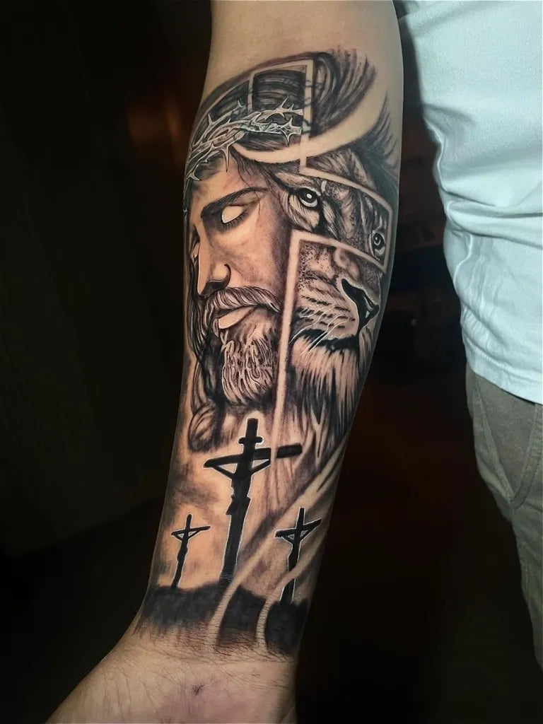 Big Black and Grey Jesus Lion and Crosses Tattoo on Men Arm by @gusbrittes_tattoo