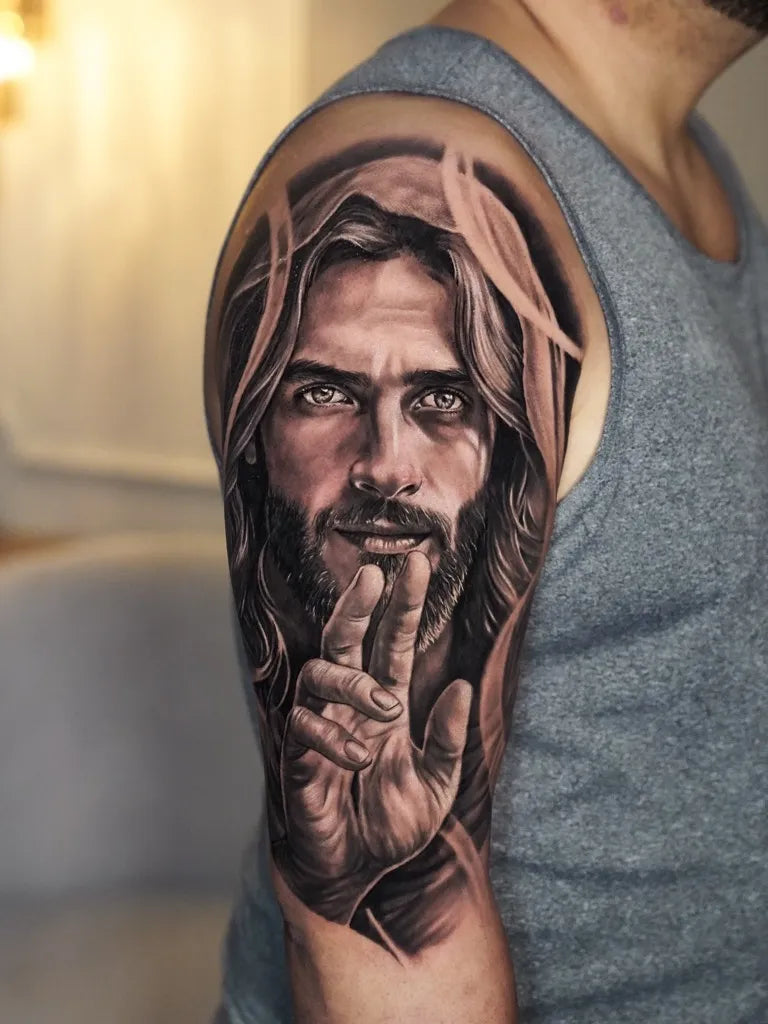 Big Black and Grey Jesus Portrait Tattoo on Men Shoulder by @rinktattoos