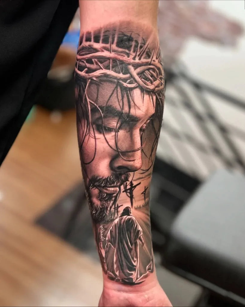 Big Black and Grey Jesus with Crown of Thorns and Cross Tattoo on Men Arm by @tiagokosstattoo