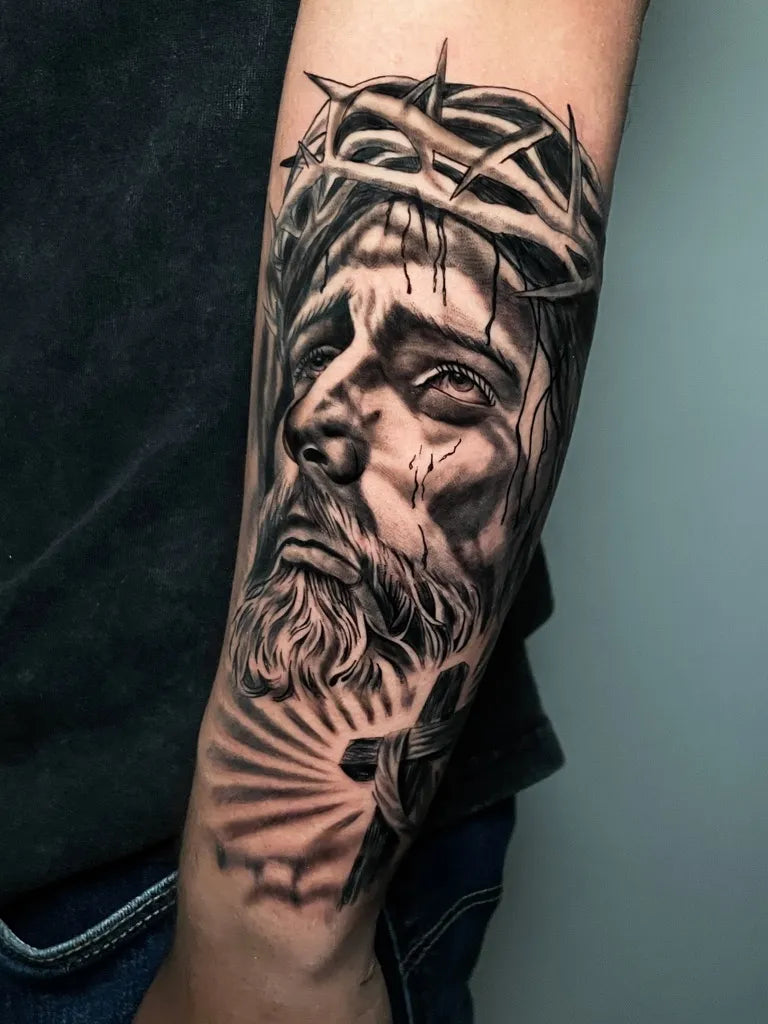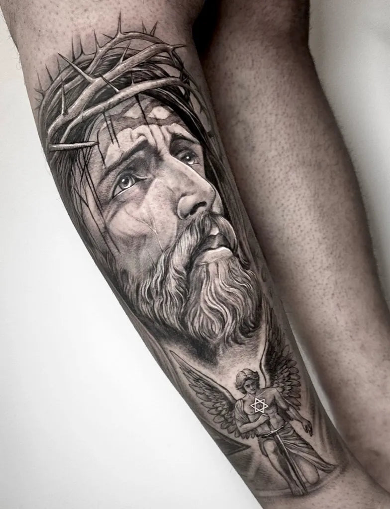 Big Black and Grey Jesus with Crown of Thorns Tattoo on Men Arm by @mattblanchardtattoos_