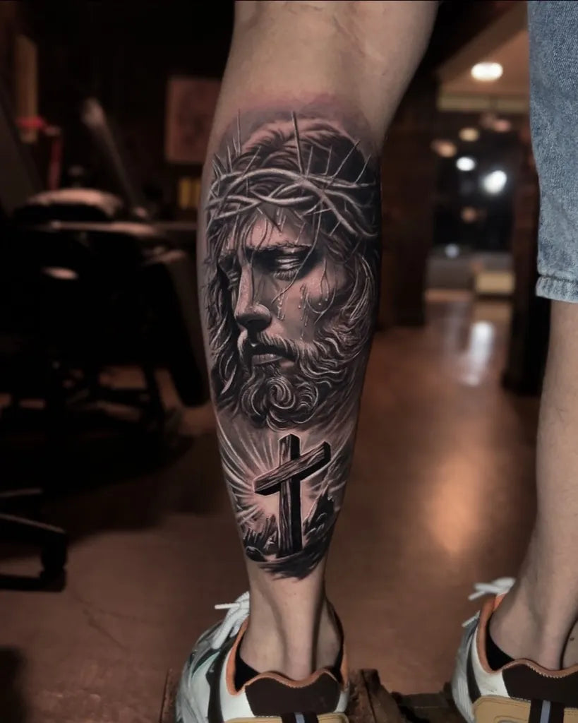 Big Black and Grey Jesus with Crown of Thorns and Cross Tattoo on Men Leg by @originalsptattoo_moema