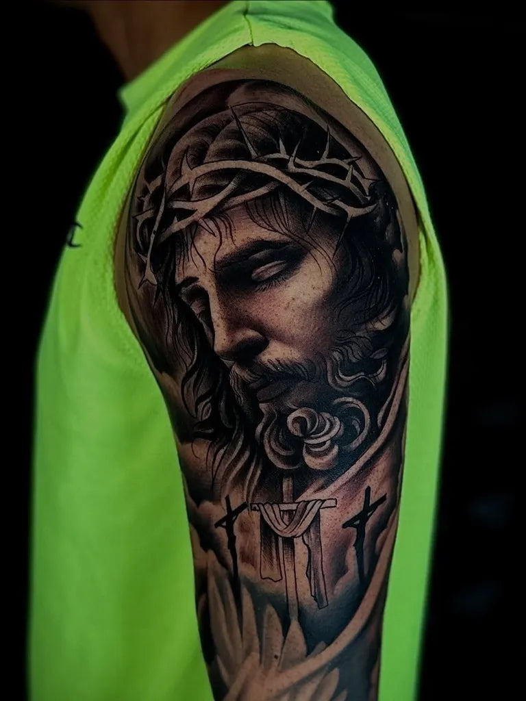 Big Black and Grey Jesus with Crown of Thorns and Crosses Tattoo on Men Upper Arm by @dapzink