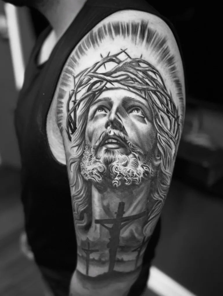 Big Black and Grey Jesus with Crown of Thorns and Cross Tattoo on Men Shoulder by @jose_tattoord