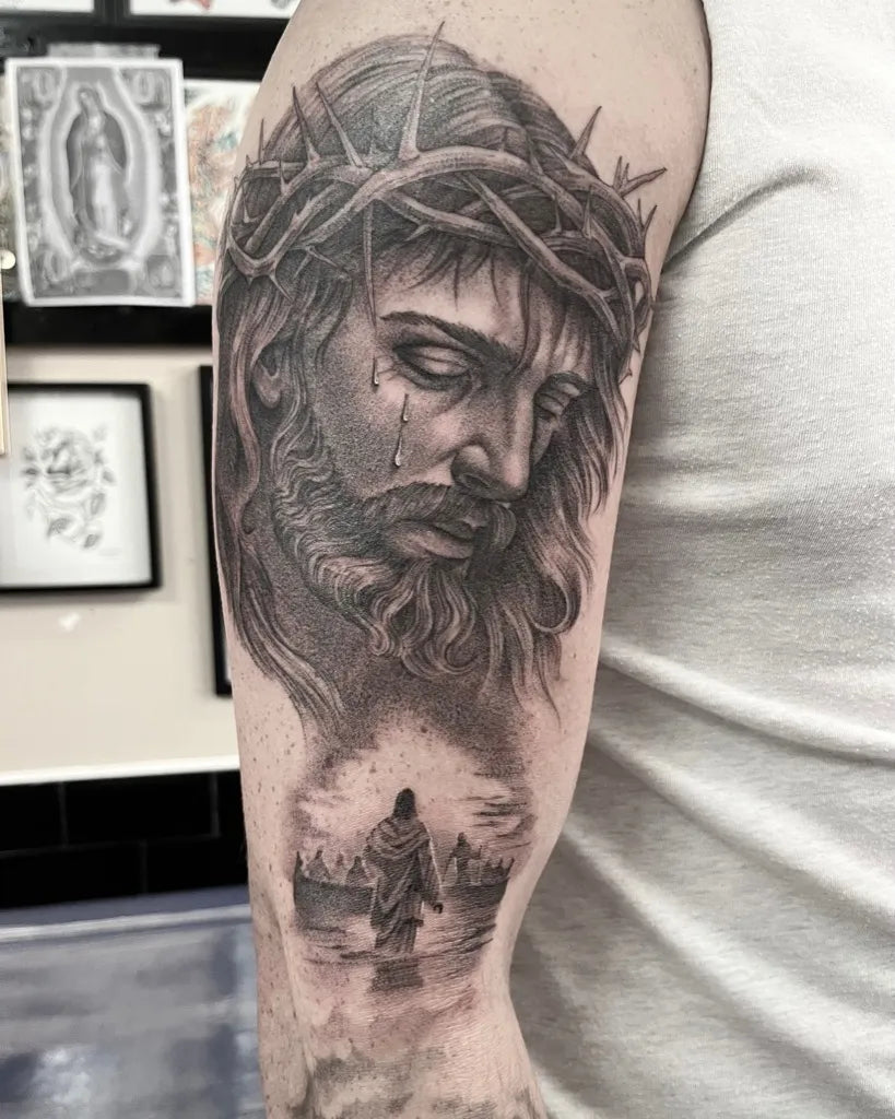Big Black and Grey Jesus with Crown of Thorns and Walking on Water Tattoo on Men Arm by @lafamiliatattoo_nqy