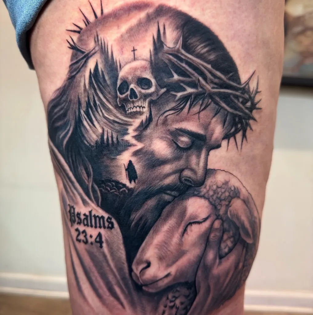 Big Black and Grey Jesus with Sheep and Skull Tattoo on Men Thigh by @art_by_brbz