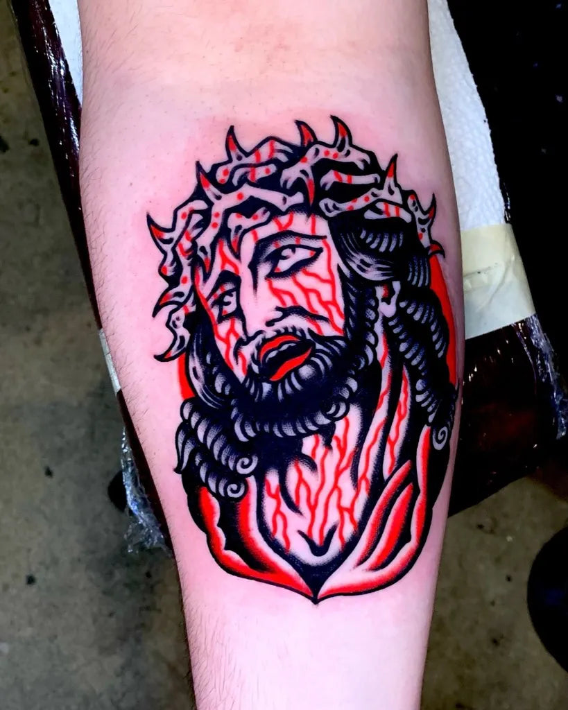 Medium Neo Traditional Jesus with Crown of Thorns Tattoo on Men Arm by @everythingwentblake