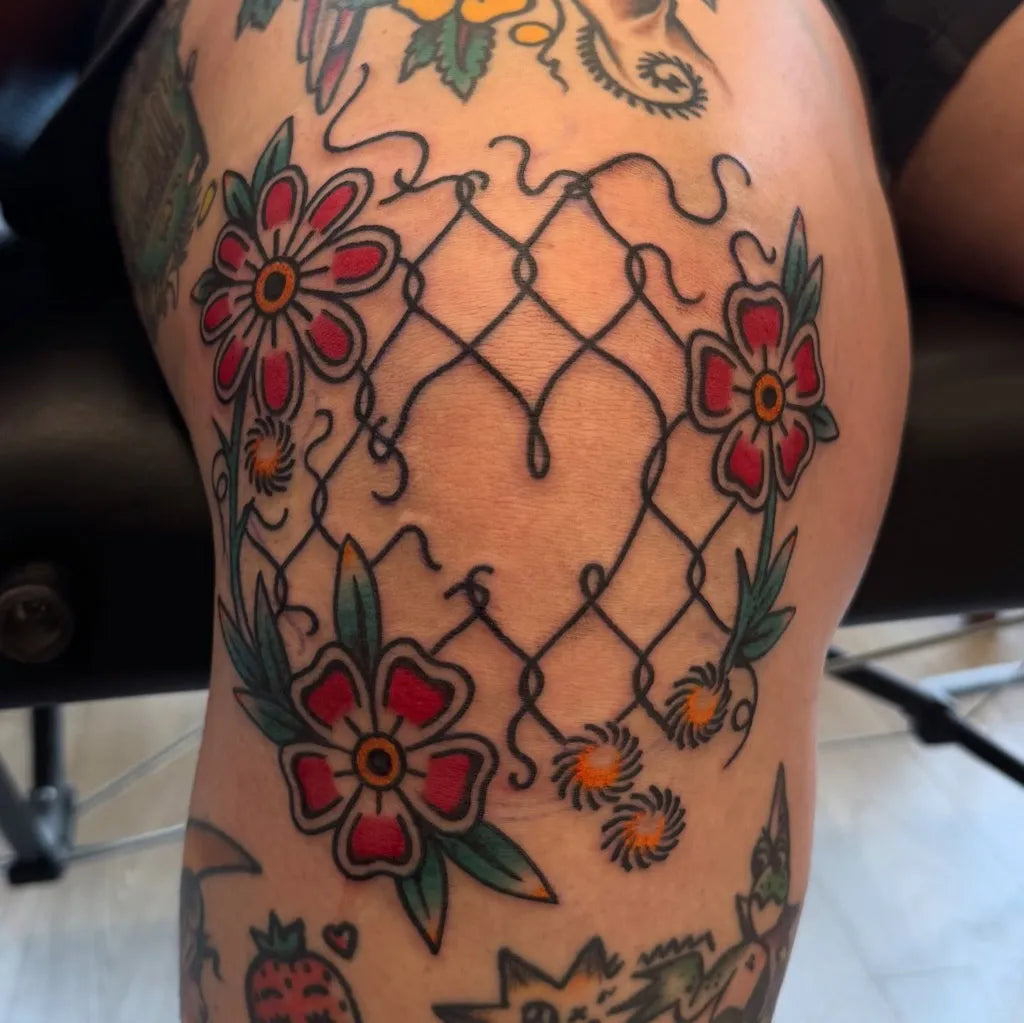Medium American Traditional Flowers and Chainlink Fence Tattoo on Women Knee by @monikadarling