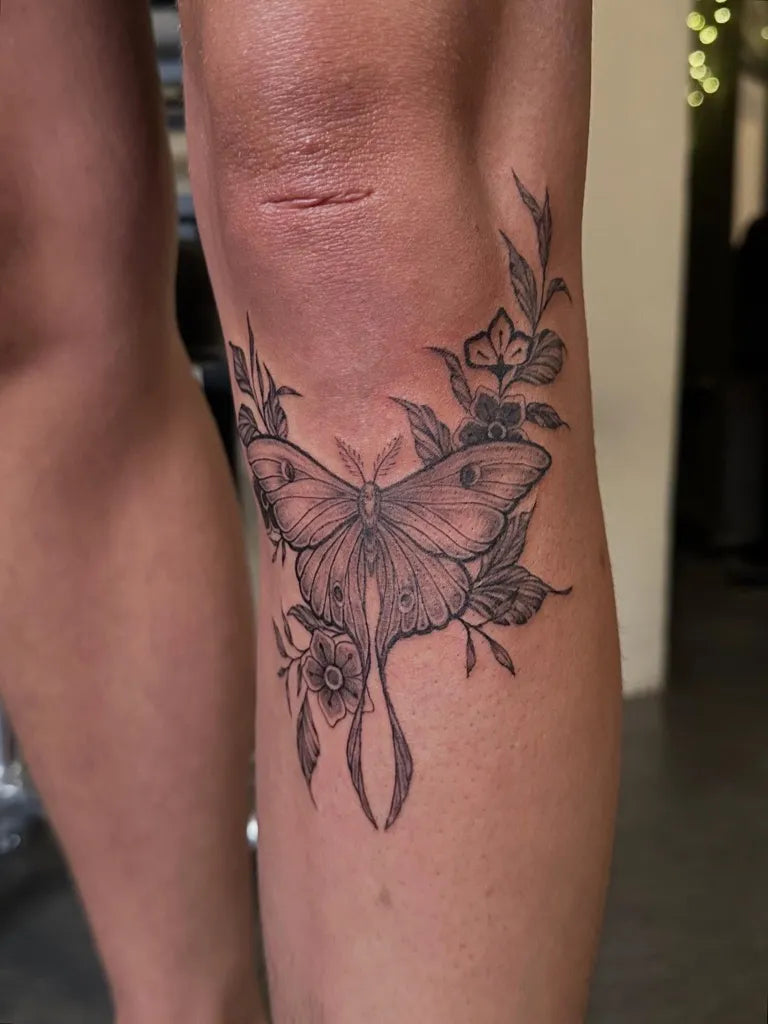 Medium Black and Grey Luna Moth and Flowers Tattoo on Women Knee by @ninareymondtattoo