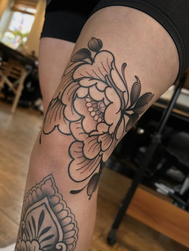 Medium Blackwork Peony Flower Tattoo on Women Knee by @pip.fox.tattoos