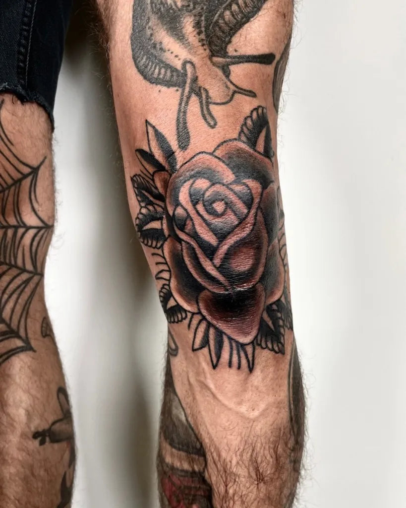 Medium Blackwork Rose and Web Tattoo on Men Knee by @abratattoo