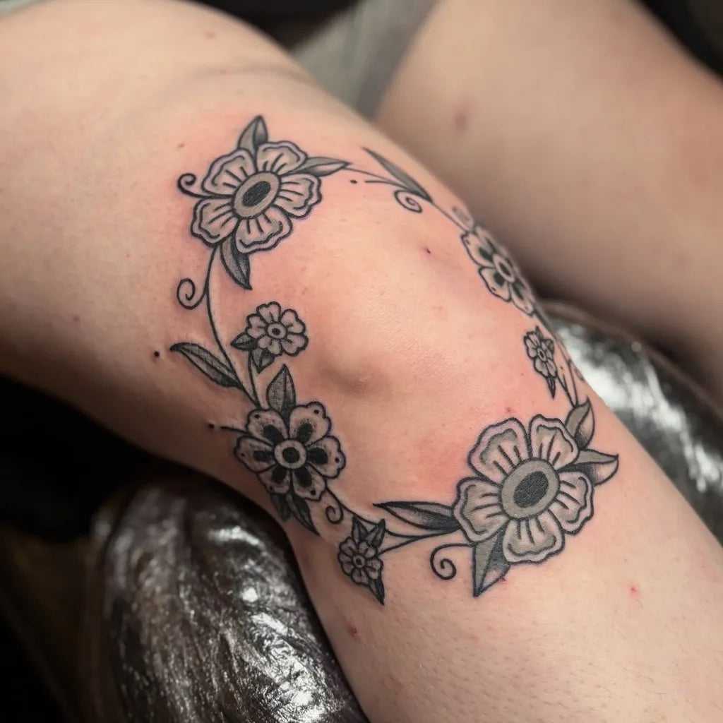 Small Blackwork Flower Wreath Tattoo on Women Knee by @moodycowtattoo