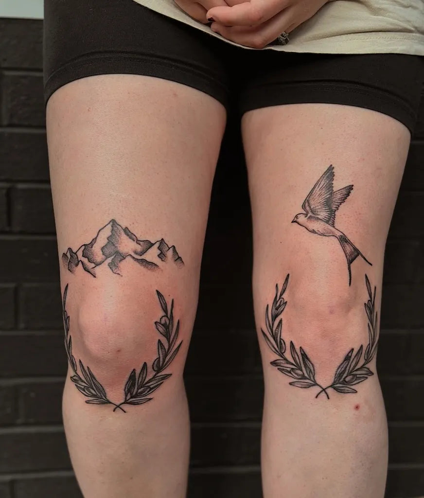 Small Blackwork Mountains Bird Laurel Tattoo on Women Knee by @calliedarresstattoos