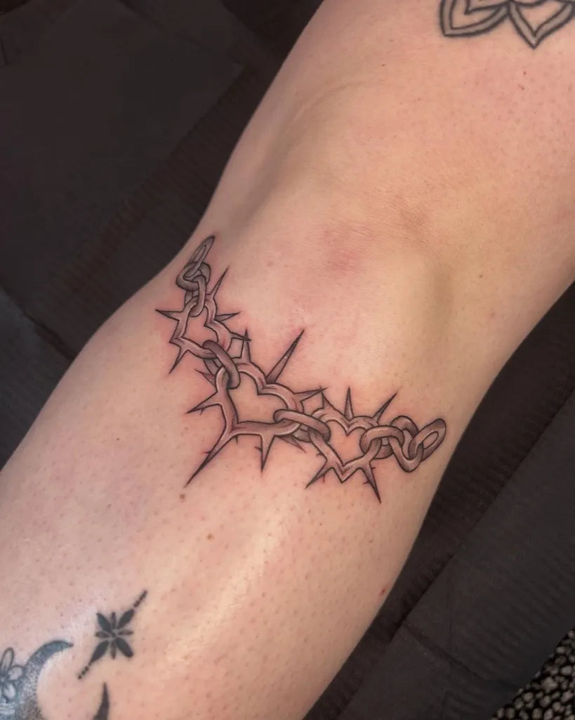 Small Blackwork Spiked Chain and Hearts Tattoo on Women Knee by @lucybethantattoos