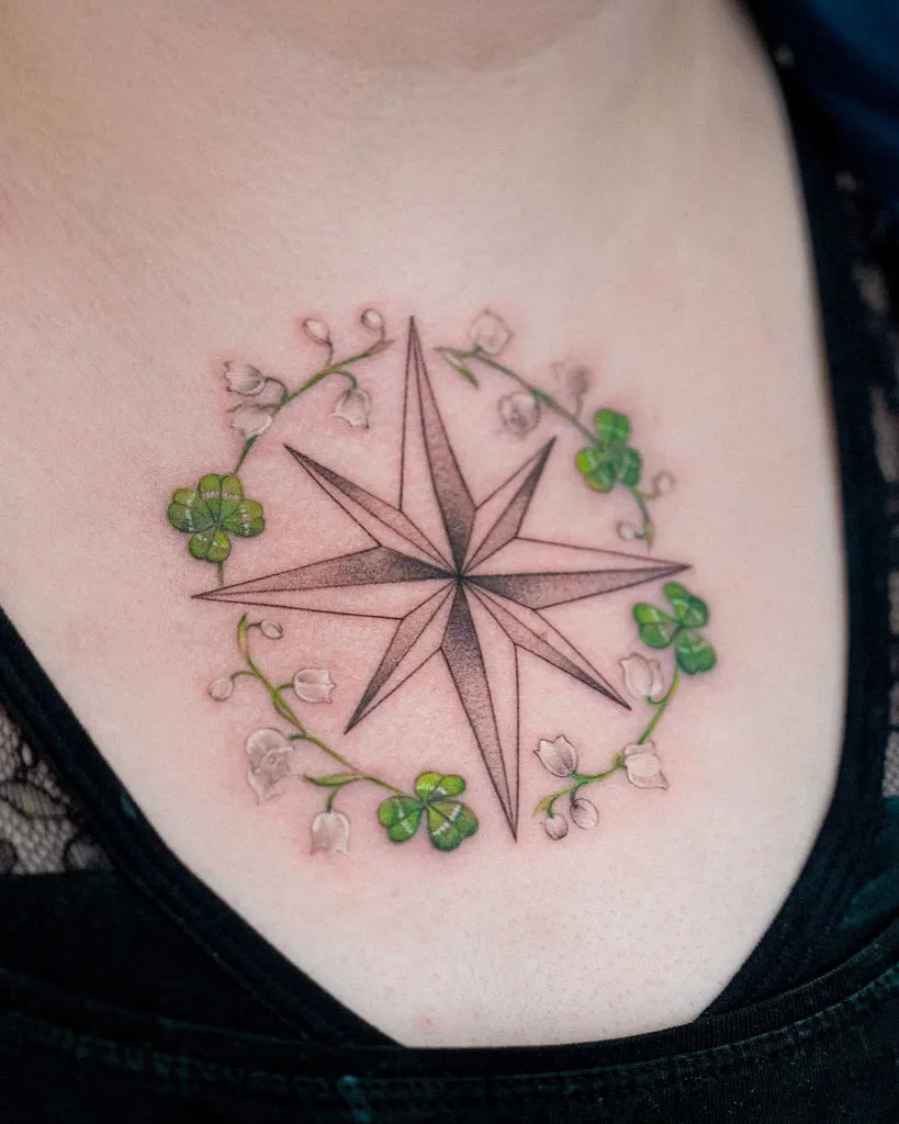 Small Fine Line Compass Lily of the Valley Shamrock on Women Chest Tattoo by @suya_ink