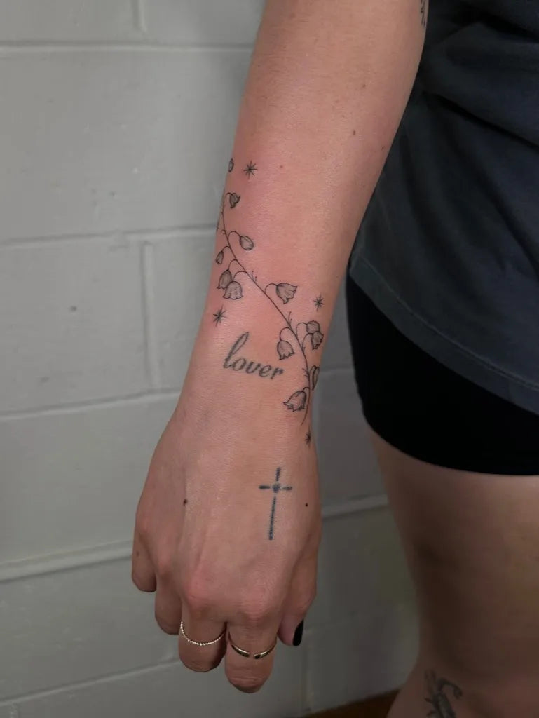 Small Fine Line Lily of the Valley and Cross on Women Wrist Tattoo by @baby.kait