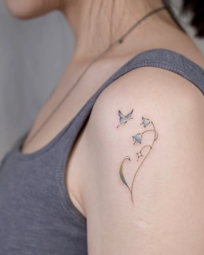 Small Fine Line Lily of the Valley and Hummingbird on Women Shoulder Tattoo by @uwendyxx.tat