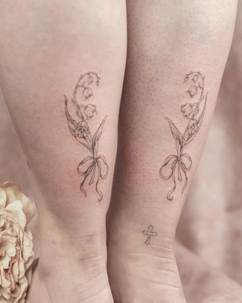 Small Fine Line Lily of the Valley with Bow on Women Leg Tattoo by @celinelilytattoo