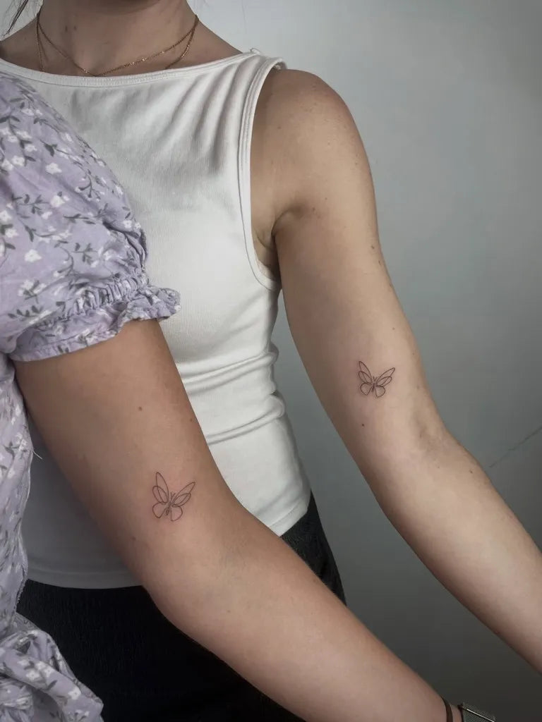 Tiny Minimalist Butterfly on Friends Arms Matching Tattoo by @sioou