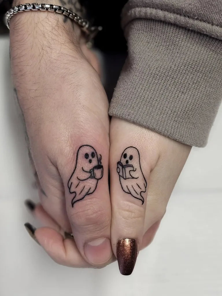 Tiny Minimalist Ghost Couple on Hands Matching Tattoo by @golonken.art.tattoo
