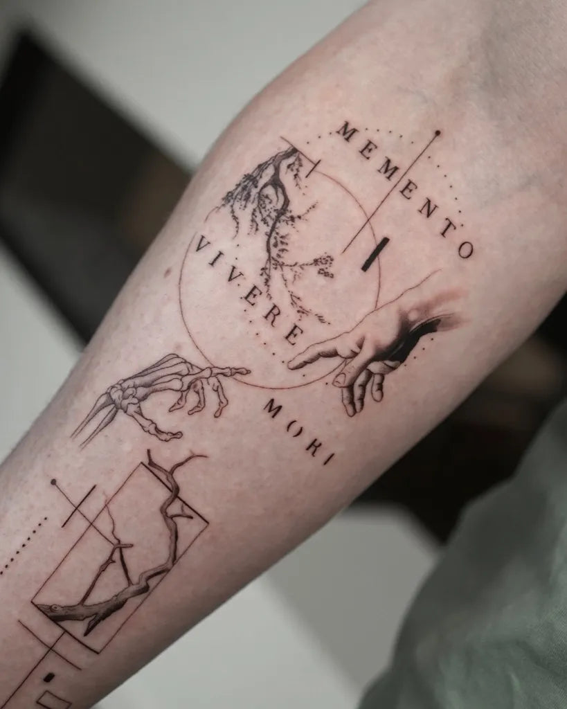 Small Minimalist Memento Mori on Men Arm Tattoo by @cosmos.tattoostudio