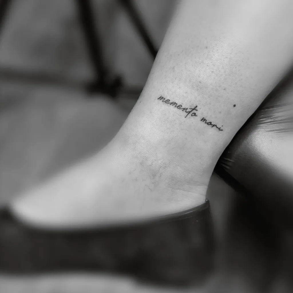 Tiny Script Memento Mori on Women Ankle Tattoo by @ausdruckstark.landau