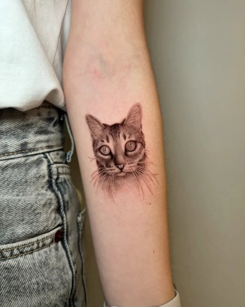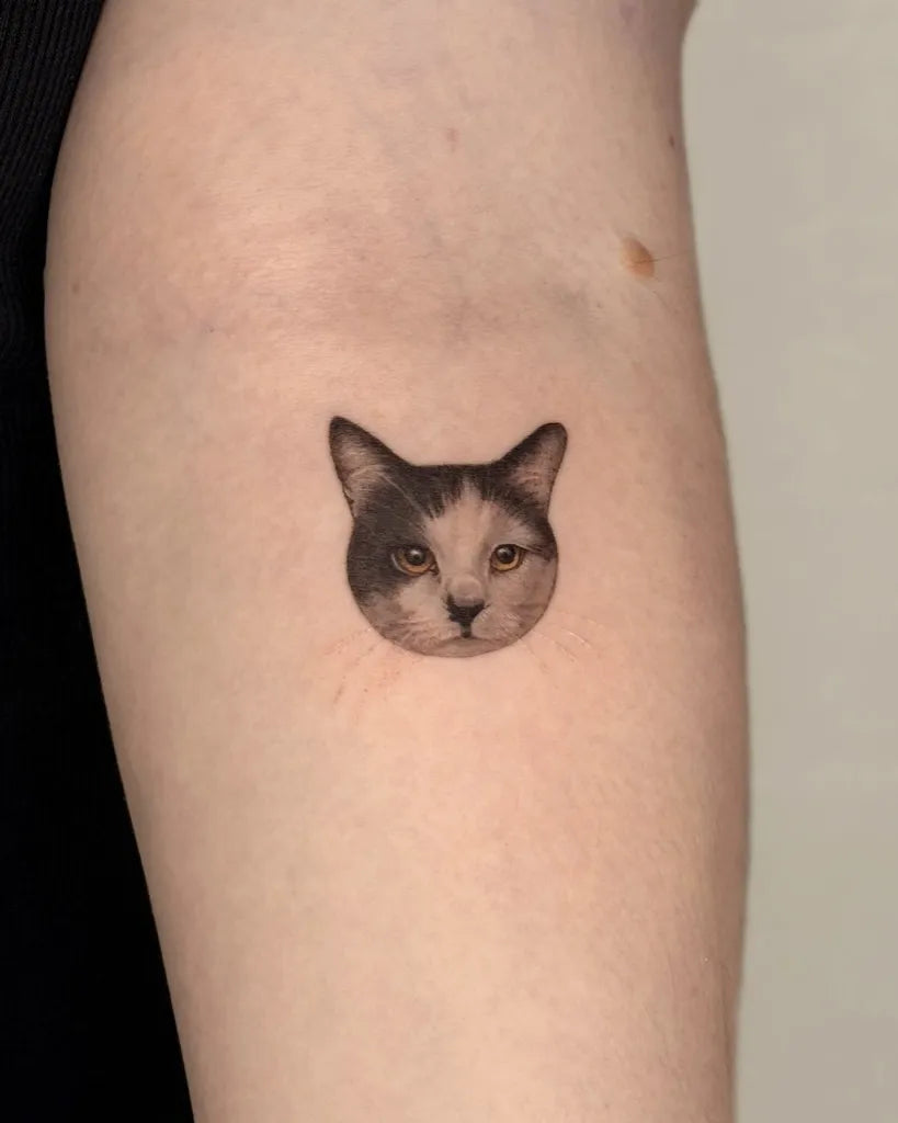 Tiny Micro Realism Cat Face on Women Arm Tattoo by @jiji.tattoos