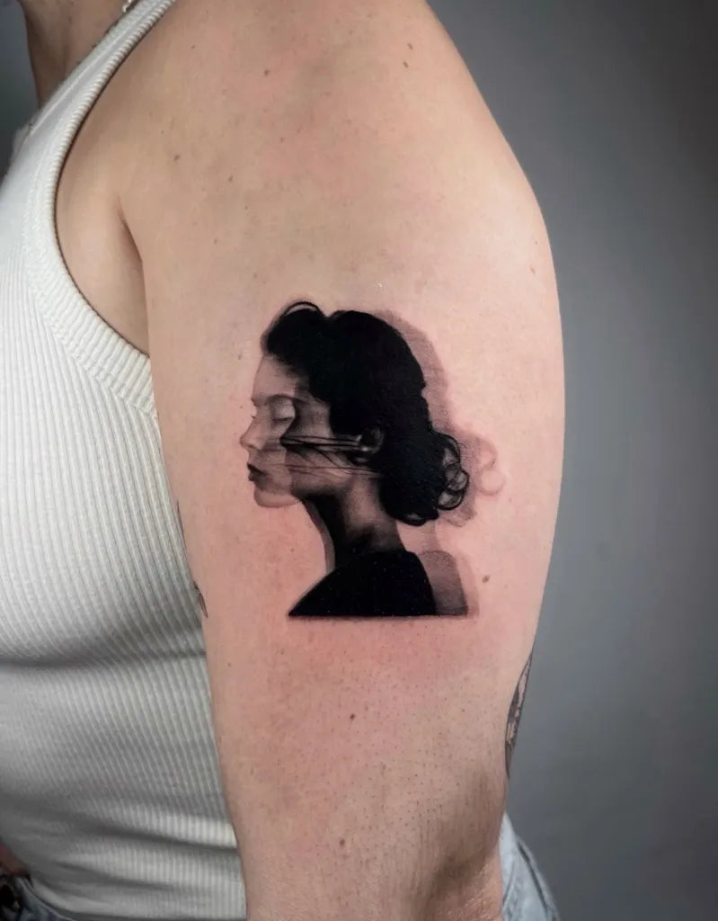 Small Micro Realism Profile Woman Silhouette on Women Arm Tattoo by @nadinee__art