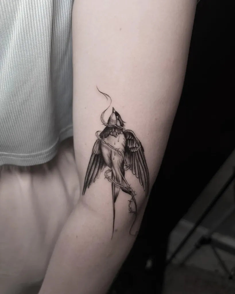 Small Micro Realism Bird and Broken Hand on Women Arm Tattoo by @selma.tattoo