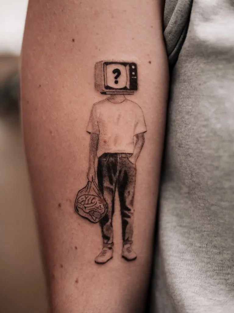 Small Micro Realism TV Head Man on Arm Tattoo by @naturaffection.ttt