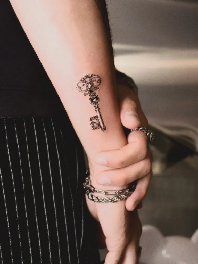 Small Micro Realism Vintage Key on Men Forearm Tattoo by @zsofi.csepai