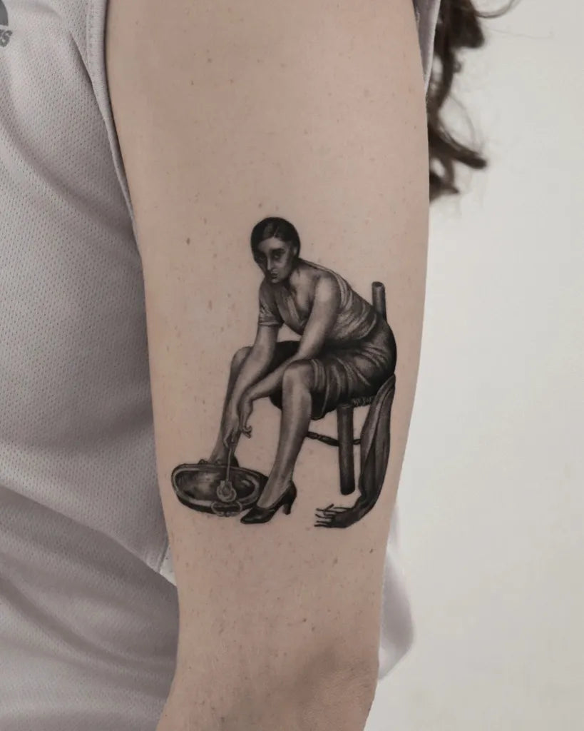 Small Micro Realism Woman Washing Feet on Women Arm Tattoo by @aliceb_tattoo
