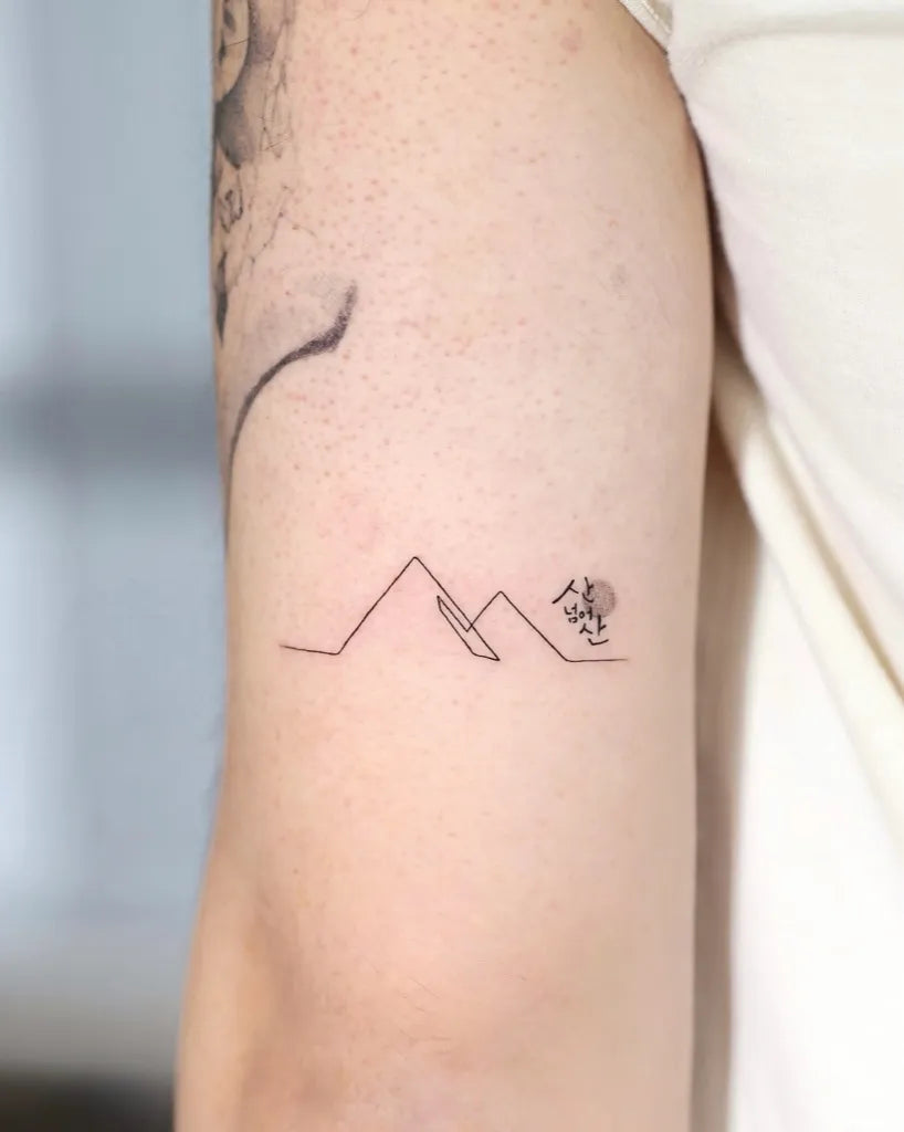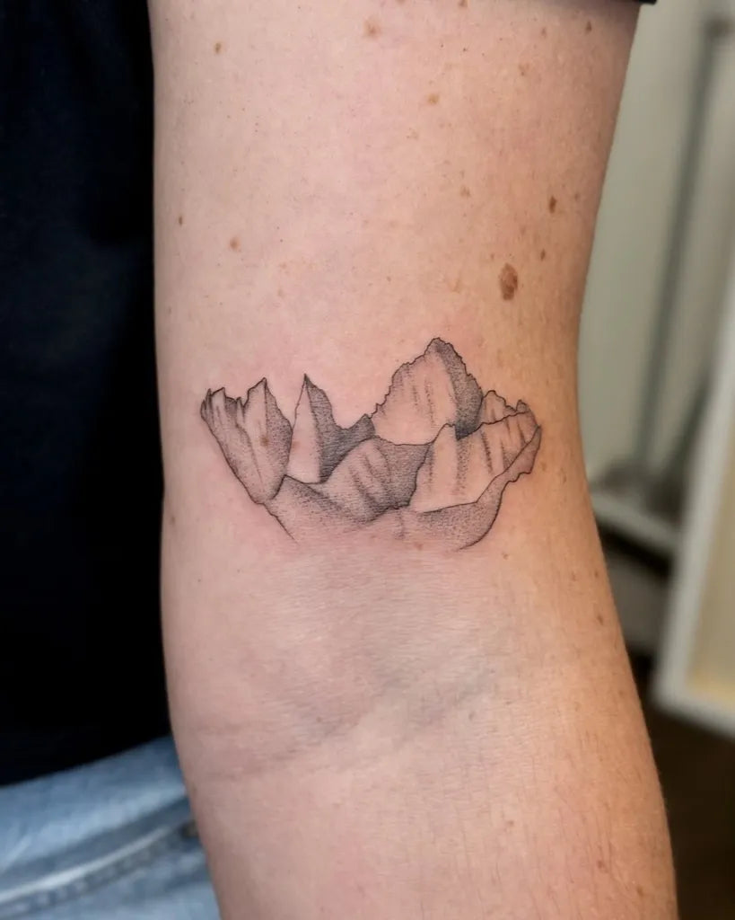 Small Minimalist Mountain Tattoo on Women Arm by @maxime.tattoo