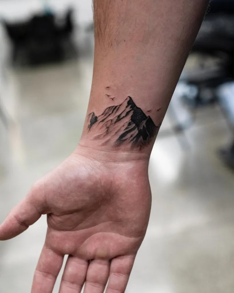 Small Black and Grey Mountain and Birds Tattoo on Men Wrist by @coenmitchell