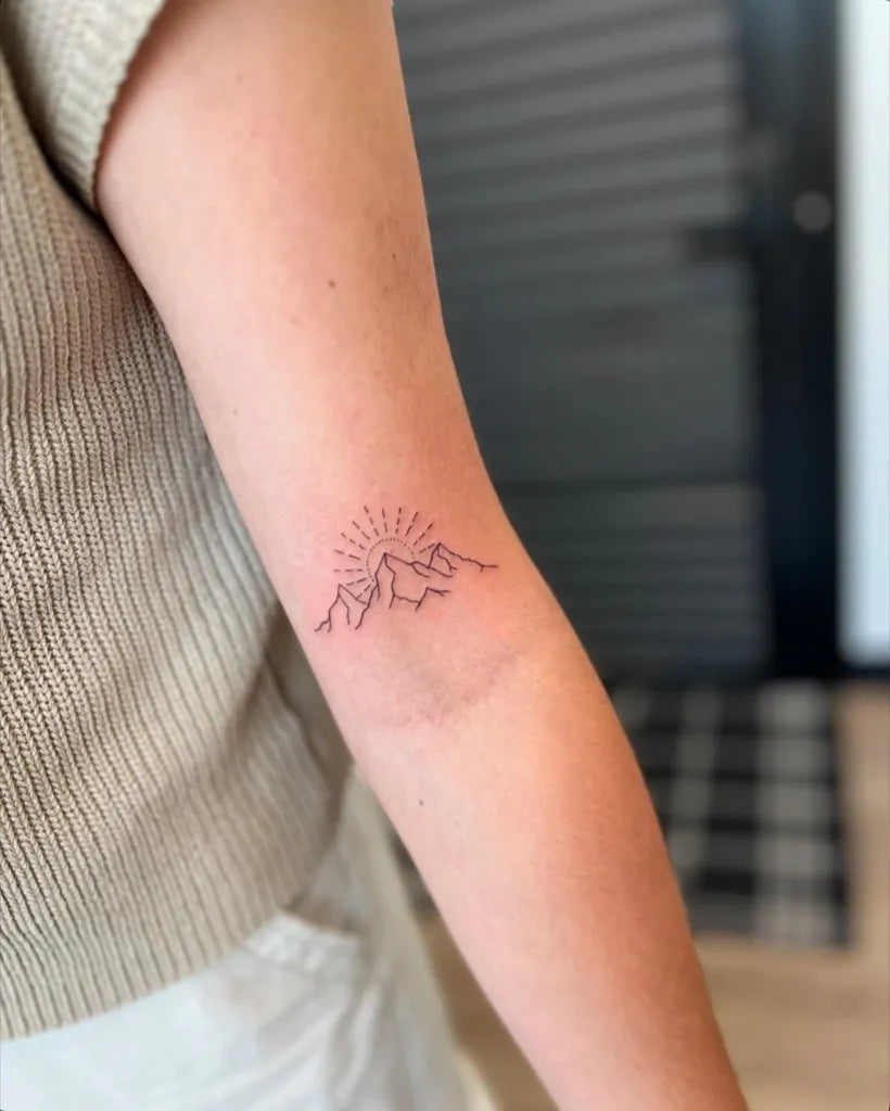Small Fine Line Mountain and Sun Tattoo on Women Arm by @lucky_you_tattoo_