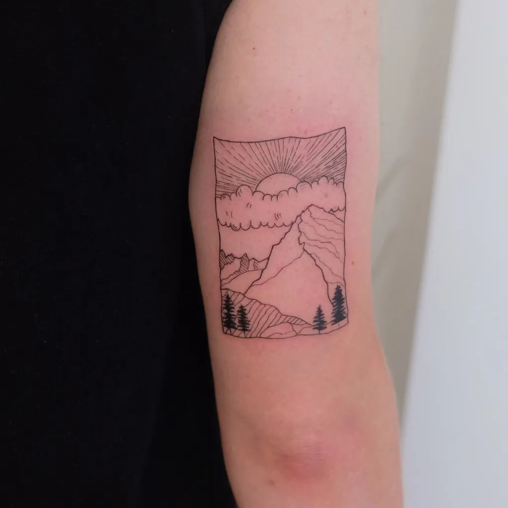 Small Outline Mountain Sun Trees Tattoo on Women UpperArm by @claudiagebauertattoo