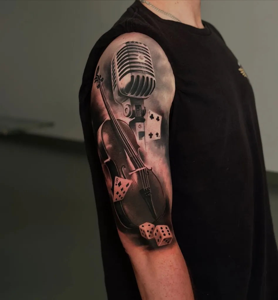 Big Black and Grey Microphone Violin Dice Music Tattoo on Men Arm by @skulltattoosbadvilbel