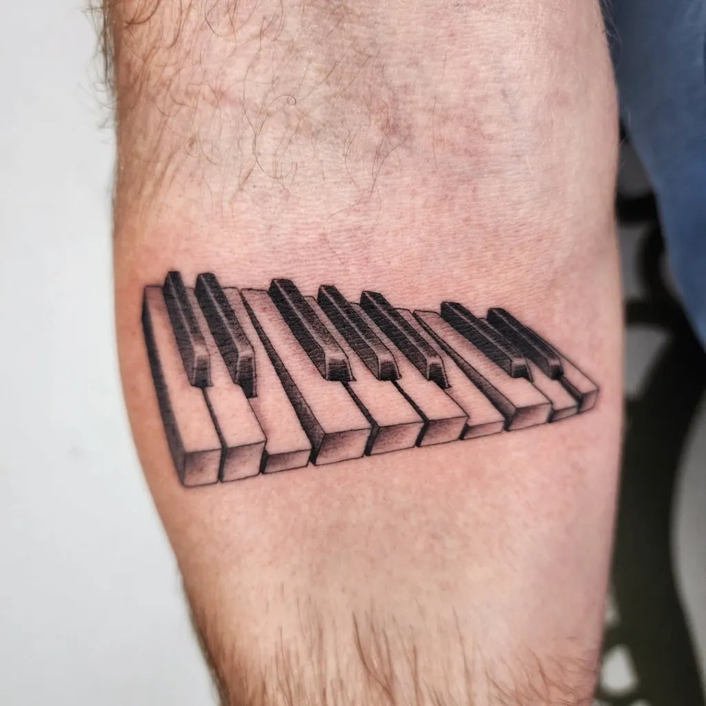 Medium Black and Grey Piano Keys Music Tattoo on Men Arm by @lwoodstattoo