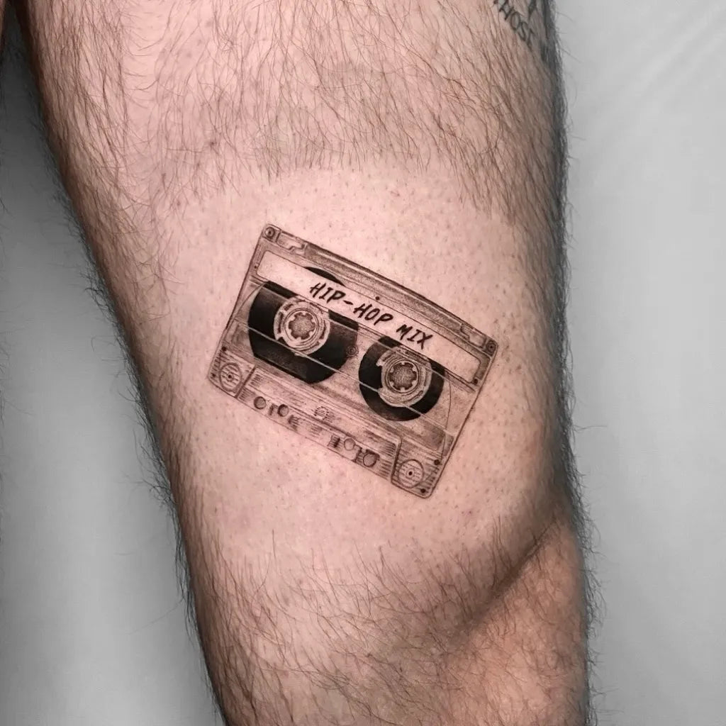 Small Black and Grey Cassette Mix Tape Tattoo on Men Thigh by @jesmisk